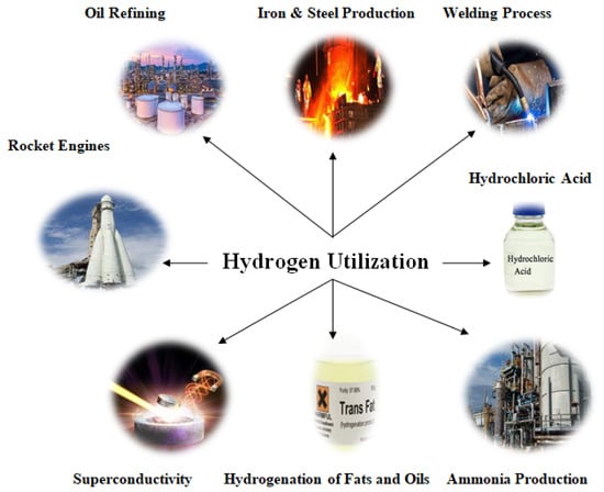 Ambitions have resulted in the developing of carbon-free energy resources such as hydrogen-based renewable energy technology. As a result, a large quantity of H2 is needed. This amount of hydrogen utilization is responsible for 27% of ammonia and 11% of methanol production. Urea and ammonia nitrate are by-products of ammonia production. Conversely, methanol is used to generate formaldehyde, methyl methacrylate, and other chemicals. To meet world steel demand, the blast furnace-basic oxygen furnace (BF-BOF) uses hydrogen to transform iron ore into steel, accounting for around 3% of overall H2 use [6,7,8]. Hydrogen can also be used in many different ways because they have many different uses, such as hydro-treating biofuels and improving oil sands. Furthermore, hydrogen can generate a high temperature that can be used for melting, gasification, drying, and other applications [9]. In addition, the welding process, hydrogenation, superconductivity, and rocket engines are all frequent uses of H2 [10,11,12], as will be discussed in greater detail in the next sections. Figure 1 represents the hydrogen utilization in different processes.