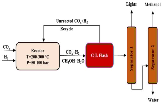 In contrast, a reverse water gas shift process captures carbon dioxide [21,22]. Hydrogen derived from renewable sources is more versatile and preferred. Mitigating greenhouse emissions and carbon dioxide capture is critical during methanol synthesis [23]. Methanol is a hydrogen carrier that can be easily converted to hydrogen using a catalytic process in a fuel reformer at temperatures between 200 and 300 °C. However, it is a much more expensive process than hydrogen produced from methanol [24]. The process flow diagram of the methanol process is shown in Figure 3 [25]. The utilization of H2 in methanol is depicted in Figure 4.
