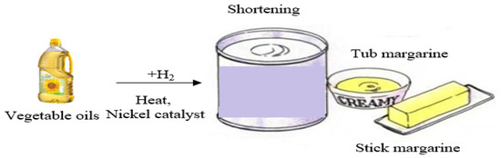 Electrochemical hydrogenation of soybean oils is carried out with platinum nanoparticles [31]. Hydrogen is electrolyzed at the anode side to form H+ when the gas pressure increases (3 MPa) throughout this process. As a result, the electrolyzer conductivity and hydrogen solubility in electrolytes both improve. Catalysts made of Ni, Pd, or Pt are used to overcome unsaturated fatty acids in fats and oils. Hydrogenation enhanced the oil’s saturated fat content, oxidation resistance, and melting point. A fuel cell structure-based polymer electrolyte membrane electrochemical reactor (PEMER) is used for electrochemical reduction. On the catalyst’s surface, hydrogen atoms are produced and added to the fatty acids’ unsaturated bonds. The overall hydrogenation reaction is described by Equations (8)–(11).