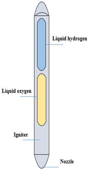 The recombination of hydrogen molecules releases 216 MJ/kg of energy, more than the amount required in space shuttle engines [38]. Hybrid fuel has the advantage of reducing the de-bonding and crack sensitivity, thus increasing the specific impulse of the rocket engine. As well, hybrid fuel-based rockets are capable of throttling, thrust termination, or restart whenever required [39]. Liquid oxygen (LOx)–hydrogen and LOx–kerosene are employed as propellants in liquid rocket engines. When combined with liquid oxygen, liquid hydrogen has a high specific impulse and superior combustion properties. Combustion is fueled by propellant injection, which results in a rise in temperature and pressure [40]. Hydrogen is a necessary fuel used in a rocket engine. Figure 6 represents the schematic diagram of a rocket.