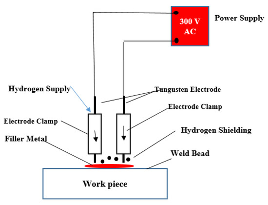 It can be welded if this steam of atomic hydrogen gas is used on the metal surface. They will return the energy gained from the arc, and the flame temperature will reach 3700 °C [44]. Ionization potential-based gases such as helium and a few percentages of pure hydrogen provide a stronger arc and more efficient welding. By TIG or MIG welding, a variety of martensitic, duplex, high alloy ferritic, and super duplex steels can be combined to make a high alloy stainless steel. When hydrogen is heated at the range of 3000 to 4500 (K), its thermal conductivity is ten times greater than that of argon, which increases the energy concentration. Hydrogen produces gas bubbles and crakes in the steel because hydrogen solubility in molten metals is very high. To melt a large amount of material, hydrogen is added to the shielding gas in arc welding, increasing the arc power and affecting the arc’s static characteristics. The higher the hydrogen content in the argon gas, the greater the melting efficiency of MIG by up to 30% to 50% due to the stronger voltage drop [45]. Figure 7 signifies the use of hydrogen in the welding process.