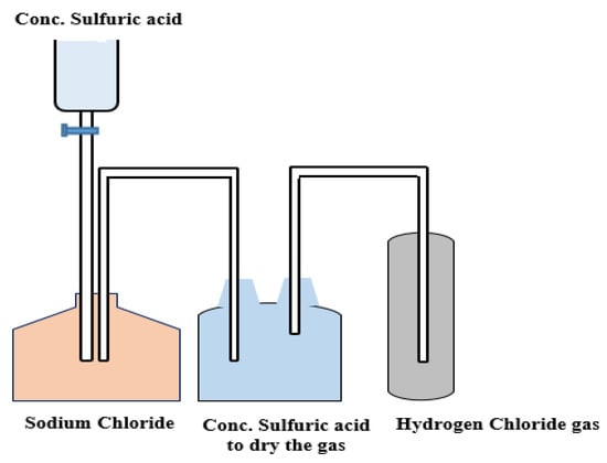 As can be seen, the reaction generates heat and appears to be accelerated by moisture. Figure 8 represents one of the most common techniques for producing hydrogen chloride, both in the laboratory and on a large industrial scale, which is the reaction of a chloride, primarily sodium chloride (NaCl), with sulfuric acid (H2SO4). Hydrogen chloride is used in various processes, including cleaning, pickling, electroplating metals, tanning leather, and refining and manufacturing different products. It produces hydrochloric acid when it comes into contact with water [46,47].