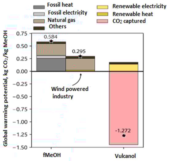 If this energy is replaced with renewable once (such as wind), the conventional methanol production process’s GWP values will decrease to 0.295 kg CO2e/FU. On the other hand, the direct GWP of the vulcanol process was 0.178 kg CO2e/FU (FU stands for functional unit), with electricity accounting for roughly 80% of H2 generation. If the energy used during the process is substituted which renewable energy, the Vulcanol process must be attributed −1.450 kgCO2e/FU negative emissions, resulting in a net −1.272 kgCO2e/FU GWP value. These results showed that by replacing the conventional methanol production process (fMeOH= fossil-based methanol) with the hydrogen-based Vulcanol process (hMeOH), more than 1.5 kgCO2e/FUwould avoid by the Vulcanol process.