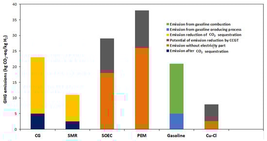 The utilization of H2 in HCl production is generally a safer process and has minimal environmental impacts. Although, HCl has some major environmental concerns. Because it is highly corrosive, HCl poses risks to monuments made of limestone, metal, and buildings [67]. Aquatic organisms may affect by the high concentrations of dissolved HCl gas in a body of water caused by accidental spills. As a result of HCl air emissions, the high HCl gas solubility leads to acid rain concerns, which can induce aquatic habitats and soil acidity above critical threshold levels. A promising treatment method for significant HCl amount is cyclic H2 and Cl economy. A novel Cu-Cl cycle that utilizes HCl waste as a raw material and produces H2 and Cl. The Cu-Cl cycle CO2 emissions are less (8.7 kgCO2/kg H2) compared to other processes, such as SMR, as the process can utilize a significant HCl quantity, which is also considered a greenhouse gas [68]. Figure 10 shows the GHG emissions of the Cu-Cl cycle and other hydrogen production technologies.