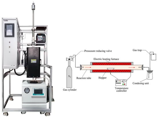 Pyrolysis experiments were carried out in a self–made pyrolysis furnace and the three–phase products were collected. The schematic diagram and the physical presentation of the pyrolysis furnace is shown in Figure 1. Before the experiment starts, N2 is passed through to expel the gas from the tube. The furnace is then programmed to heat up to 600 °C and this temperature was held. The container filled with material is quickly pushed into the furnace to allow it to pyrolysis. The reaction is finished when no more gas is produced. The sample is 10 g mixture and 1 g catalyst.