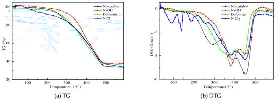 TG and DTG curves of co–pyrolysis with different catalysts.