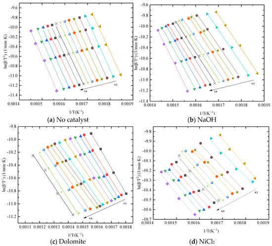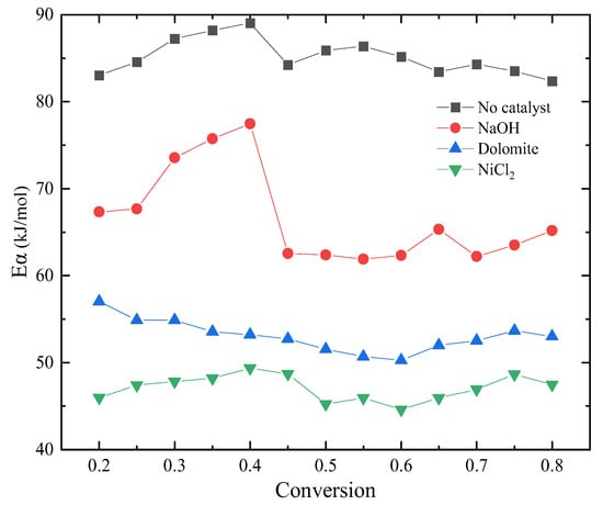 Kinetics of blends catalytic co–pyrolysis were determined by using KAS method at the selected degrees of conversion ranging from 0.2 to 0.8. Figure 3 shows the Arrhenius plot of blends with catalysts at different degrees from KAS method. It can be seen from the figure that the catalyst has different effects on the reaction process. Moreover, the variation in activation energy with conversion is revealed in Figure 4. From the comparison of activation energy values, the three catalysts all reduced the Eα required for the reaction process. Among them, the reduction effect of dolomite and NiCl2 is the most obvious. The Eα of sample without catalyst was within the range of 82–89 kJ/mol. The Eα of sample with NaOH was within the range of 65–78 kJ/mol. The difference is that when the conversion is between 0.3 and 0.4, the Eα increased by 10%. This indicates that the reaction resistance is large at this stage. Dolomite and NiCl2 make the Eα reduce to 55–60 kJ/mol and 45–50 kJ/mol, respectively.