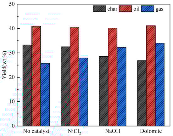 As shown in Figure 5, the yield of oil remains at 41 wt% with different catalysts. So, it can be judged that the catalysts has almost no effect on the yield of pyrolysis oil. Mixing dolomite and NaOH increased the yield of gas. The yield of char decreased. This proves that NaOH and dolomite can promote pyrolysis to generate more gases. When there is no catalyst mixing, the yield distribution of pyrolysis products are char 33.6%, oil 40.8%, and gas 25.6%. NiCl2 has little effect on product distribution. The yield of gas increased by 3%, 7%, and 10%, respectively.