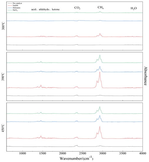 Based on the DTG curves of Figure 2, the pyrolysis process has three peak temperature values, 300, 390, and 450 °C. The corresponding FTIR spectrogram for the gaseous products at peak temperature values are shown in Figure 6. The IR spectrum of samples with catalysts show absorbance in the range of 1410–1580, 2350–2450, 2750–3000, and 3740–3950 cm. It indicates the main substances are C=O, CO2, CH4, and H2O [,,]. The largest relative peak area is CH4. Next is CO2. At high temperatures, gases containing C=O functional groups such as acids, aldehydes, and ketones precipitate. Comparing with the curve of no catalyst, the absorption peak of CH4 significant increase with catalyst. NaOH has a great influence on gas release. A small amount of H2O is also observed.