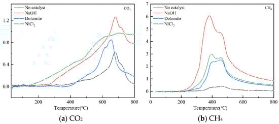 CH4 and CO2 are the main recyclable products in pyrolysis gas. They are the main raw materials for producing synthetic gas through methane drying and reforming method []. Figure 7 shows the infrared spectrum of CO2 and CH4 from 20–800 °C with different catalysts. Where CH4 is detected and decomposition starts from 280 °C to 530 °C. CO2 is released at 260–800 °C. The maximum CO2 intensity released by NaOH catalytic pyrolysis was at 600 °C. The maximum strength of CH4 formation is at 400 °C. All the catalysts can enhance the production of CH4. NaOH shows the most significant effect on the release of CO2 and CH4. The NaOH catalyst doubled the relative intensity of CH4 and CO2 peaks. From the perspective of manufacturing synthetic gas, NaOH is a better catalyst.