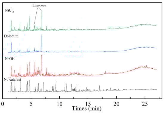 Figure 8 shows the total ion chromatogram of Py–GC/MS with different kinds of catalysts. It can be seen that the pyrolysis products of blending are mainly composed of macromolecular. The products are mainly acid organics, and macromolecule acids. The content of olefins, alkanes, and other organic compounds are relatively low. Compared with the co–pyrolysis oil without catalysts, the components detected after using the catalysts was small molecule unsaturated alkenes. This indicates that the three catalysts can effectively promote the decomposition of macromolecular substances into small molecular substances. Compared to the peak plots without catalysts, the peaks of limonene in the plots with catalysts are all enhanced. Table 5 compares the content of limonene in pyrolysis oil and the yield of pyrolysis oil under different operating conditions. By comparison, NaOH has the most significant effect on improving the yield of limonene in pyrolysis oil. The yield reaches 19.65% when with 10% NaOH. Moreover, the yield of oil did not decrease. Compared to previous studies, the yield of limonene has also increased significantly. It provides a reference pathway for the production of limonene.