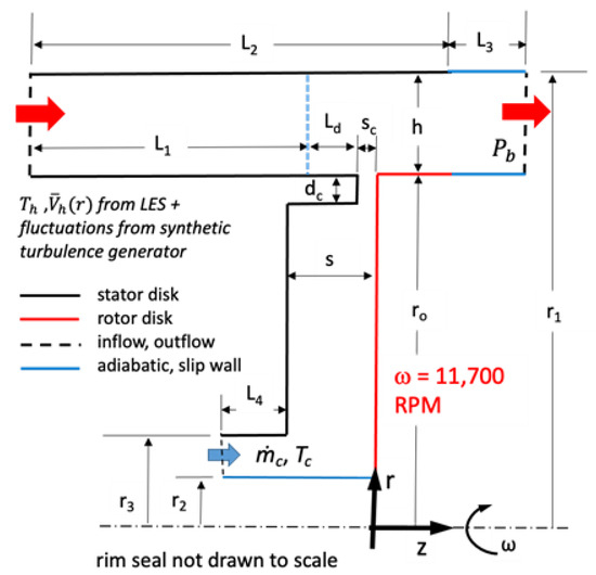 A schematic of the stator–rotor configuration studied is shown in Figure 1. The hot gas path is an annulus with inner radius ro = 116.25 mm and outer radius r1 = 165.25 mm. The stator disk extends from z = −(L1 + Ld + sc) to z = −sc, and the rotor disk extends from z = 0 to z = L2 − (L1 + Ld + sc), where L1 = 150 mm, L2 = 210.7 mm, Ld = 10 mm, and sc = 1.7 mm. An axial seal is located between z = −sc and z = 0, and it has a thickness of dc = 4.5 mm. The distance between the stator and rotor disks is s = 16.7 mm. An extension section of length L3 = h was appended to the rotor to ensure no reverse flow at the outflow boundary. For this extended section, the walls were adiabatic and allowed to slip so that no heat or friction are added. Sealing flow is fed from an annular duct of length L4 = 20 mm with inner radius r2 = 10 mm and outer radius r3 = 12 mm. For this annular duct, the inner wall was modeled as adiabatic and allowed to slip.