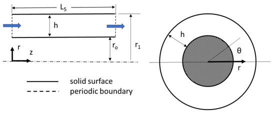 Concerning the length of the annular duct, L5, it was set long enough to ensure that turbulence at the inlet and the outlet, the two periodic boundaries, is not correlated. According to Kim et al. [26], that length should be 6.4 Dh, where Dh is the hydraulic diameter. In this study, L5 = 6.4 h = 3.2 Dh was found to be adequate based on the longitudinal two-point correlation. To reduce computational cost, only an angular sector of the annular duct was simulated, invoking periodicity in the azimuthal direction. According to Quadrio and Luchini [25], the minimum angular sector needed for LES depends on the curvature parameter, . If 1, then the effects of curvature can be neglected [25]. For the annular duct studied, 0.5, which is less than unity. Thus, the sector size only needs to meet the requirements of LES for planar channel flows. For planar channel flows, Kim et al. [26] recommended a spanwise dimension of , which is equal to an angle of for the annular duct. In this study, a sector of was used.