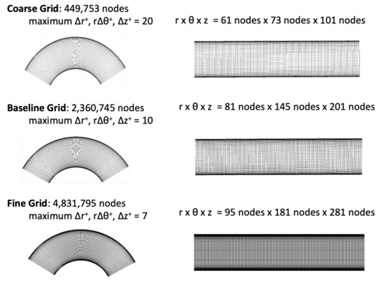 Figure 3 shows the three grids used in the grid-sensitivity study: a coarse grid with 61 × 73 × 101 nodes, a baseline grid with 81 × 145 × 201 nodes, and a fine grid with 95 × 181 × 281 nodes. For all three grids, the first cells next to the walls are clustered such that y+ is less than unity. Additionally, there are at least five cells within y+ = 5. The nondimensional grid spacings are Δr+ < 20, Δz+ < 20, and rΔθ+ < 20 for the coarse grid, Δr+ < 10, Δz+ < 10, and rΔθ+ < 10 for the baseline grid, and Δr+ < 7, Δz+ < 7, and rΔθ+ < 7 for the fine grid.