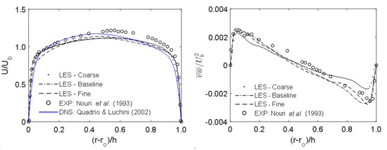 Mean axial velocity and axial-radial velocity correlation in the annular duct obtained by the three grids [24,25].