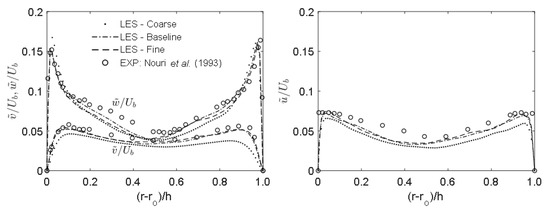 Root mean square of the velocity fluctuations in the annular duct obtained by the three grids [24].