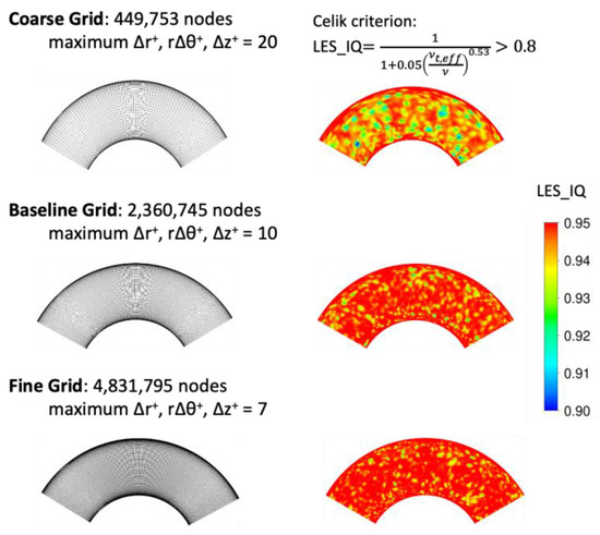 With s, all three grids were inspected to see if they satisfy the Celik criterion [27], which states that the LES_IQ must be greater than 0.8. In Figure 6, it can be seen that the LES_IQ values for all the three grids are greater than 0.9 everywhere in the annular duct, which is greater than the required level of 0.8. This shows that 90+% of the turbulent kinetic energy in the flow is resolved by the LES.