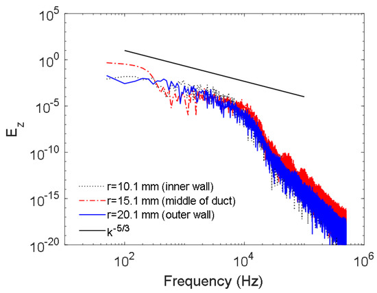 Figure 7 shows the energy spectra from the axial velocities at three probe locations in the annular duct obtained using the baseline grid: r = ro + 0.05, (ro + r1)/2, r1 − 0.05, z = 3.2 h, and θ = 60°. From this figure, the energy spectra can be seen to follow Kolmogorov’s −5/3 law for a range of frequencies before falling. The energy densities associated with high frequencies are at least seven orders lower than the energy densities corresponding to low frequencies in the inertial sub-range. Thus, the grid resolution of the baseline grid is adequate.