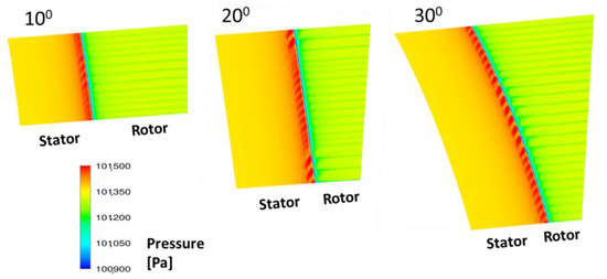 The problem description, formulation, and method of solution for the rotor–stator configuration were already described in previous sections. Concerning the size of the computational domain in the azimuthal direction, the angle of the sector must be sufficiently large to resolve the relevant flow physics. RANS was used to run three sector sizes—10°, 20°, and 30°—to examine the nature of the flow in the azimuthal direction. Figure 9 shows the pressure distribution on the surface of the hot gas path located at r = ro. From this figure, variations in the azimuthal direction can be seen, and the wavelength of those variations are much smaller than the arc length intercepted by a sector of 10 degrees. Additionally, the wavelength of the variations is independent of the sector size. Thus, the 10-degree sector is sufficient for this study based on RANS.