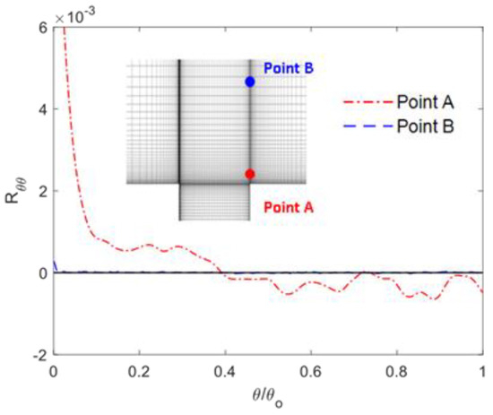 Though the 10-degree sector may be adequate for RANS, for LES, the azimuthal velocities at the two periodic boundaries in the azimuthal direction must be uncorrelated. Thus, a simulation was performed with LES to ensure that this is indeed the case. Figure 10 shows that the azimuthal two−point correlation is indeed uncorrelated if the sector size is 10 degrees (even for Point A).