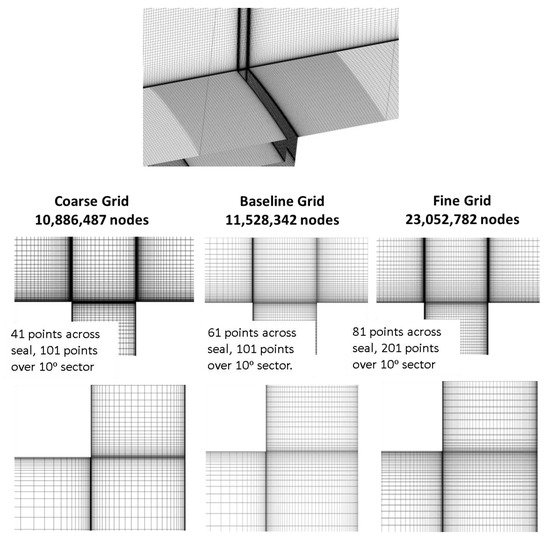 Figure 11 shows the three grids used in the grid-sensitivity study: a coarse grid, a baseline grid, and a fine grid. The number of grid points across the seal clearance is 41 for the coarse grid, 61 for the baseline grid, and 81 for the fine grid. The number of grid points across the 10° sector in the azimuthal direction is 101 for the coarse and baseline grids and 201 for the fine grid. For all grids, the first cells next to the walls are clustered such that y+ is less than unity (see Figure 12). Additionally, there are at least five cells within y+ = 5. Away from the seal, the nondimensional grid spacings satisfy Δr+ < 30, Δz+ < 30, and rΔθ+ < 30 for the coarse grid, Δr+ < 20, Δz+ < 20 and rΔθ+ < 20 for the baseline grid, and Δr+ < 10, Δz+ < 10 and rΔθ+ < 10 for the fine grid. In the seal region, the highest friction velocity was used to compute the nondimensional spacings.