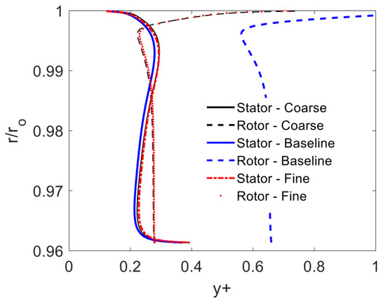 y+ at one grid point away from the stator and rotor walls around the seal for the three grids used—coarse, baseline, and fine.