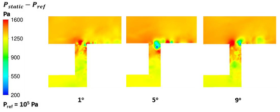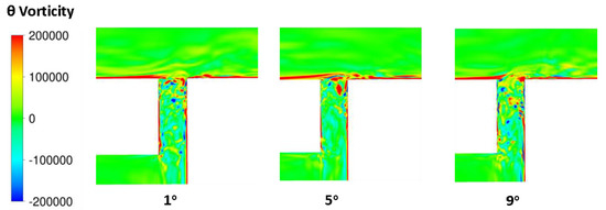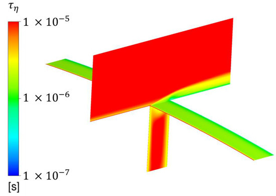 On the time step size, it needs to be small enough to resolve the small time scales in the flow. The Kolmogorov time scale, , can be used as a starting point to estimate the necessary time step size. Figure 13 shows the Kolmogorov time scale, , obtained from the RANS solution based on the SST model. From Figure 13, the time scale that needs to be resolved is between 10−7 and 10−5 s. A time step-size sensitivity study showed that s is adequate.