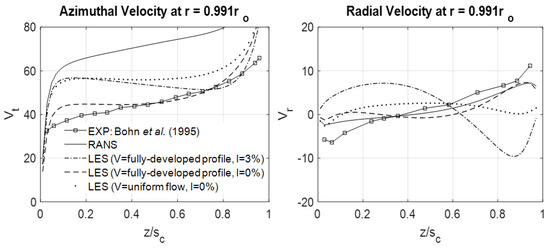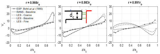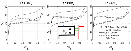 Regarding validation, the most challenging part is to ensure that the computational study is solving the same problem as the experimental study. For the rotor–stator configuration studied, the thickness of the boundary layer at an upstream location where the flow is still unaffected by the seal and rotor should be provided by the experimental study, but it was not. Thus, this computational study assumed “fully-developed” turbulent flow in the annulus of the hot gas path with at the inflow boundary, and the resulting comparisons are given in Figure 14 and Figure 15. To examine the effects of boundary-layer thickness, an LES was performed using a fully developed turbulent profile and at the inflow boundary (i.e., the LES has no turbulent fluctuations). Without turbulent fluctuations, the fully developed profile could not be sustained by LES, and the velocity profile approaches that of a laminar profile because shear is only driven by viscosity.