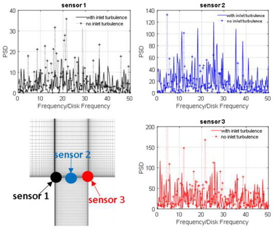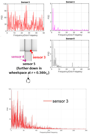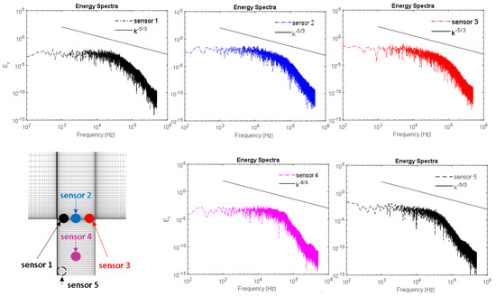 Figure 16 shows the energy spectra based on the radial velocities from five probes in the seal region for the baseline grid. From this figure, it can be seen that the energy spectra follow Kolmogorov’s −5/3 law for a range of frequencies before falling. The energy densities associated with high frequencies are at least seven orders lower than the energy densities corresponding to low frequencies in the inertial sub-range. Therefore, the grid resolution (baseline grid) is adequate for the rim seal configuration.