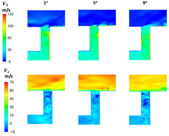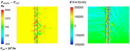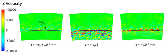 The instantaneous flow from LES with I = 3% at the inflow boundary is given in Figure 19, Figure 20, Figure 21, Figure 22, Figure 23, Figure 24 and Figure 25. Figure 19, Figure 20, Figure 21, Figure 22, Figure 23 and Figure 24 show the instantaneous pressure, vorticity, and velocity, and Figure 25 shows power spectral density (PSD) for pressure at several locations around the seal. From Figure 20, Figure 21 and Figure 22, one can see the shedding of vortices at the seals’ backward-facing step and their impingement at the seal’s forward-facing step via the vorticity and pressure contours. Figure 22 also shows a wavy shear layer in the azimuthal direction around the rotor surface at r = ro via alternating regions of high and low velocity magnitudes. This wavy shear layer with its corresponding wavy displacement thickness, is created by two mechanisms: (1) Kelvin–Helmholtz instabilities (KHI) that form from the interaction between the hot gas flow in the axial direction and the boundary-layer flow in the azimuthal direction above the rotating rotor, and (2) vortex shedding (VS) on the backward-facing step of the seal. This wavy displacement thickness causes alternating region of high and low pressures on the rotor side of the seal, and this can be seen in Figure 19, Figure 23 and Figure 24. At z = −10−3 mm, Figure 19 and Figure 24 show the pressure peaks and vortical structures repeating six to seven times over a 10-degree sector so that the frequency, normalized by the frequency of the rotor’s rotation, , is 6 × 36 = 216 to 7 × 36 = 252.