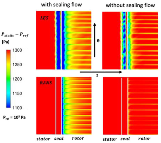 - Though RANS with the SST model was able to predict regions of high and low pressures around the rotor side of the seal, it was unable to predict ingress. LES coupled with the WALE model could predict regions of high and low pressures around the rotor side of the seal and the ingress that they create.