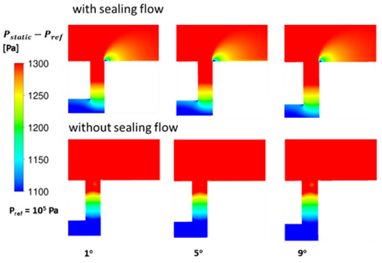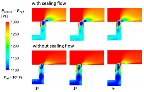 For this rotor–stator configuration with an axial seal, the gas that enters the hot gas path is air with zero swirl. Its mass flow rate and temperature are = 3.42 kg/s and , amounting to Rew = . The pressure at the exit of the hot gas path is Pa. The sealing flow that enters has a mass flow rate of kg/s and a temperature of K, amounting to . Simulations were also performed with zero sealing flow, where the entrance was made into an adiabatic slip wall to examine the worst-case scenario. The rotor rotates at a constant angular velocity of = 11,700 RPM, amounting to . All surfaces in black (stator and outer radius of annulus) and red (rotor) are no-slip and adiabatic. Surfaces in blue (extension section and part of the sealing flow feed duct) are slip and adiabatic.