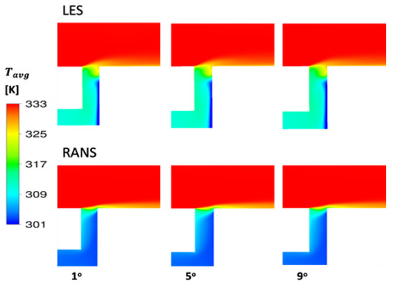 The problem described in the previous section were computed by using steady RANS and LES. For RANS, the governing equations used are the ensemble-averaged continuity, Navier–Stokes, and energy equations for a thermally and calorically perfect gas. Effects of turbulence were modeled by the shear stress transport (SST) model [19]. The boundary conditions used are as follows: At the inlet of the hot gas path, velocity (a “fully-developed” profile based on incompressible flow with zero swirl) and temperature (a uniform profile) were specified. At the outlet of the hot gas path, pressure was specified. At all solid surfaces except those marked in blue in Figure 1, the no-slip, adiabatic wall boundary conditions were imposed. At solid surfaces marked in blue, the slip, adiabatic wall boundary conditions were imposed.