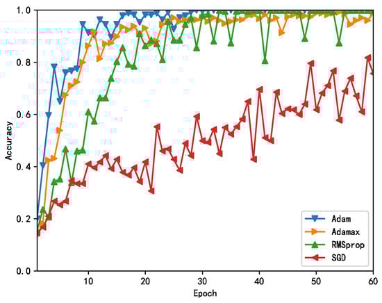 Data of seven different bearing operating conditions with labels of 0–6 are selected to train the RRP-DCNN model. The number of training samples selected for each bearing operating condition is 40, and a total of 280 samples are used for model training. In addition, the number of verification samples selected for each bearing working condition is 20, and a total of 140 samples are used for model verification. In the model training stage, in order to select the best optimization algorithm, four algorithms of SGD, RMSprop, Adamax and Adam are used for experimental comparison. The comparison chart of the model training accuracy is shown in Figure 6. The training curves of SGD is the slowest. The convergence rate of RMSprop is faster, but it always fluctuates. The training curve of Adam is faster than that of Adamax, and the accuracy rate can be stabilized to 100%. Therefore, the Adam algorithm is selected as the optimizer.