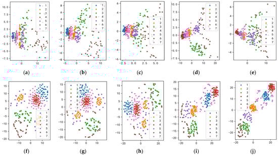 Feature visualization of training samples: (a) PCA-origin; (b) PCA-conv_1; (c) PCA-maxplooing_1; (d) PCA-conv_2; (e) PCA-maxplooing_2; (f) T-SNE-origin; (g) T-SNE -conv_1; (h) T-SNE-maxplooing_1; (i) T-SNE -conv_2; (j) T-SNE -maxplooing_2.