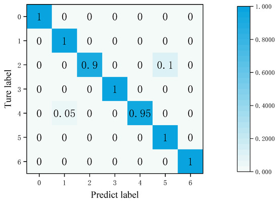 In order to verify the effectiveness of the method, input the verification sample data into the trained RRP-DCNN model. The result of diagnosis and recognition is automatically generated in the form of a confusion matrix, as shown in Figure 9. The horizontal axis represents actual operating conditions, and the vertical axis represents predicted operating conditions. The dark part of the diagonal line is the maximum probability value that the actual working condition is predicted to be correct. The other part is the probability value of the prediction error for other conditions. The predicted probability values from 0 to 100% correspond to the color map on the right. This type of classification result can be directly and clearly read out the classification accuracy rate of each working condition in the form of percentage from the graph. Due to the similarity in fault characteristics between fault 2 and fault 5, the recognition accuracy is relatively low. The recognition accuracy of fault 4 is 95%, while fault 2 has a lower recognition accuracy of 90%. This is in line with the intersection of the two fault clustering results in Figure 7. The accuracy of other fault identification is 100%. Overall, the fault diagnosis method based on RRP-DCNN is effective, achieving an average fault recognition accuracy of 97.86%.