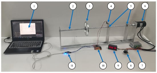 Fault diagnosis test bench. (1) Upper computer. (2) Shaft. (3) Loading disk. (4) Acceleration sensor. (5) Bearing. (6) Motor. (7) Motor driver. (8) Speed adjustment button. (9) Speed display. (10) Data acquisition board. (11) Serial communication [27].