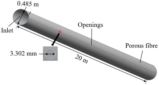 This study considers a fiber duct with 72 open holes, each with a diameter of 3.302 mm, spaced 0.276 m apart, a tube wall thickness of 0.2 mm, and an aperture ratio of 0.061. The air outlet is designed to be ejection permeable, with air flowing outward through the porous fiber pores and the openings. Figure 3 presents the physical model of the ejection-permeable FADS, which serves as the basis for the modified FADS models examined in this study.