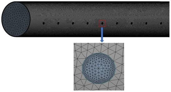 To ensure the reliability of the CFD simulation method, the numerical model was designed to match the experimental model in terms of pipe length, diameter, opening spacing, number of openings, opening diameter, and opening angle. Furthermore, the pipe wall was thickened to 4 mm using the equivalent discounting algorithm, and the openings were also meshed using a densified technique. The final grid comprised 5.703 million cells.