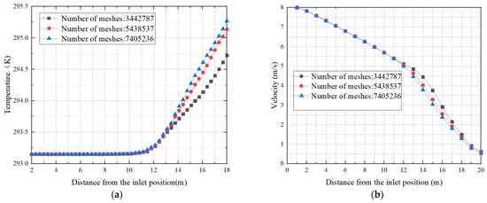 To ensure the accuracy of the calculated results, it is necessary to verify the independence of the grid. To achieve this, three sets of grids were used: 3.443 million, 5.439 million, and 7.405 million, with the same boundary conditions. The results, as shown in Figure 5, indicate that the temperature rise trends and speed change trends corresponding to the three different grid numbers are basically the same, with differences within 5%. This verifies grid independence. It is observed that the differences between the results for 3.443 million grids and for the latter two grid numbers are relatively large, while the difference between the latter two is negligible. The values of at the wall surface for the three grid schemes are, respectively, 230 for 3.443 million grids, 80 for 5.438 million grids, and 35 for 7.405 million grids. The latter two mesh schemes can better meet the requirements of wall , which makes the simulation more accurate. Considering the need for both computational efficiency and accuracy of the results, we chose a total grid number of 5.438 million for subsequent calculations and analysis.
