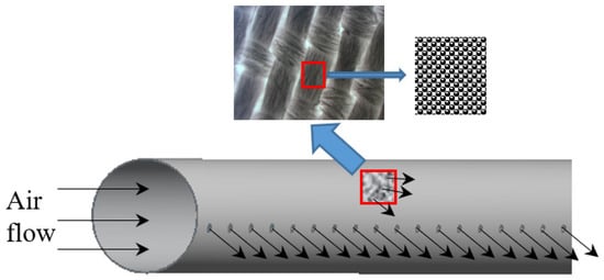 The inlet of the system was set as a velocity inlet. The fiber layer region on the wall of the FADS is modeled as a porous medium. The outermost surface of the wall is set as a pressure outlet, and the openings on the FADS are also set as a pressure outlet. The schematics of ejection-permeable FADS is shown in Figure 8. The SIMPLE algorithm was used to iteratively solve the coupled pressure and velocity equations. The pressure discretization equations were solved using PRESTO, while the others were solved using second-order upwind differencing. The convergence criteria were defined as the residuals of velocity, turbulent kinetic energy , and dissipation rate being less than 10−5, and the residuals of temperature being less than 10−6.