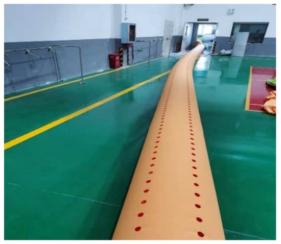 In order to assess the reliability of the CFD simulation method, experimental measurements were conducted to observe the variation of flow velocity along the interior of the FADS system. The field experiment layout is shown in Figure 7. The duct had a length of 20 m, a diameter of 0.485 m, a wall thickness of 0.2 mm, and a hole spacing of 0.16 m. It had 144 holes with a diameter of 24.15 mm, and the hole directions were set at 10.30 and 1:30 o’clock. The airflow velocity inside the fiber duct was measured using a thermal anemometer with a range of 0–20 m/s, a resolution of 0.01 m/s, and an accuracy of ±0.05 m/s. Measurements were taken at intervals of 2 m, starting at 2 m from the entrance of the duct, after the system reached a stable state; the average value was obtained from three trials.