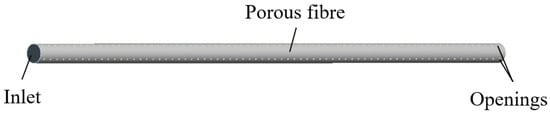 In the model, many small holes are opened in the wall. Since the thickness of the tube wall (of order 10−4 m) and the length of the tube (of order 101 m) differ by many orders of magnitude, a non-structured grid is deemed a better choice. The wall of the fiber tube is discretized to enhance the accuracy of the calculation, and the fluid at the opening is also discretized. Additionally, boundary layers are formed near the inner wall surface of the tube, as illustrated in Figure 4.