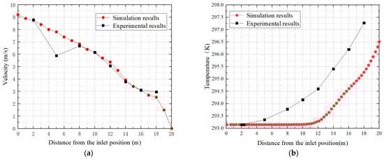 Comparison of experimental data and simulation results. (a) Flow velocity and (b) temperature.