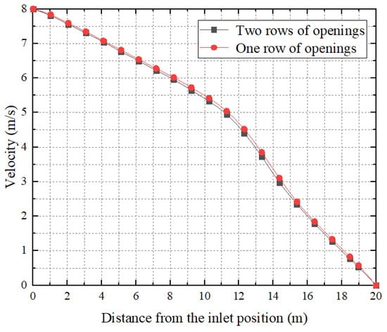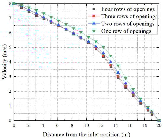 Air velocity inside the duct will gradually decrease due to factors such as escape to the outside, injection, and loss of resistance along the way. Figure 11 shows the variation of the central velocity in the four kinds of FADS with different numbers of openings. From Figure 11, it can be observed that the internal velocity of FADS with four different configurations of rows follows a similar trend, decreasing smoothly from 8 m/s at the entrance to zero at the closed end. These results are consistent with the trend of the results of previous studies on the variation of flow velocity inside FADS [,]. Specifically, the flow velocity decreases at an almost uniform rate for the first 10 m from the entrance for all four types of openings. Beyond 10 m, the rate of reduction in flow velocity increases, and after 15 m, the rate of decrease stabilizes. The flow velocity inside the duct with only one row of openings is consistently higher than with the other three types of openings (except, of course, at the inlet and end points). The larger the number of openings, the smaller the flow velocity at the same location inside the duct. This is because with more openings, air can more easily exit the duct, leading to a more rapid decrease in internal air velocity and a smaller flow velocity at the same location inside the FADS with more rows of openings.