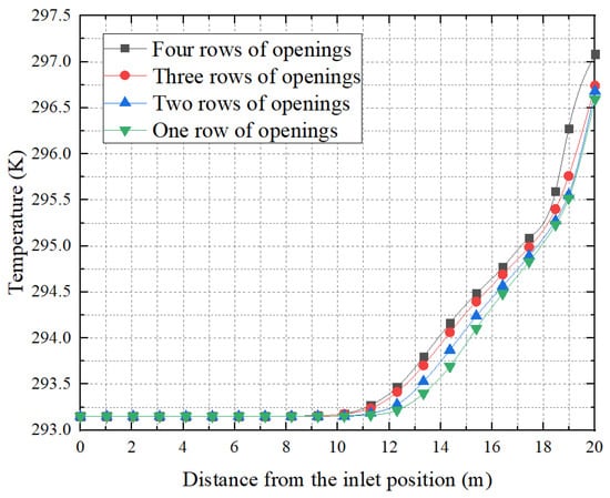 In summer conditions, the air temperature outside the tube is higher than the air supply temperature, resulting in convection and conduction that heat the air inside the tube. Figure 12 shows the variation of the central temperature in the four kinds of FADS with different numbers of openings. From Figure 12, it can be observed that the internal temperature of FADS with four types of opening rows follows a similar trend. The temperature rises almost uniformly from 13 m to 17 m and then accelerates again near the rear end at 18 m. The temperature rise of the FADS with four rows of open holes is significantly higher than for the other three, with the end temperature exceeding 297 K and rising by about 3.9 K. The temperature rise for the FADS with three rows of open holes is slightly higher than for the FADS with one and two rows of open holes, and the temperature rise for the FADS with two rows of open holes is slightly higher than for the FADS with one row of open holes. These three FADS experience a temperature rise of nearly 3.5 K. The temperature rise inside the tube is closely correlated with the airflow velocity. Higher flow velocities facilitate more efficient air ejection and enhanced air penetration from the surface of the duct, resulting in reduced heat transfer from the external environment and subsequently lower temperature changes. Conversely, when the flow rate in the pipe is low, the air flow is more susceptible to the external environment, resulting in a higher temperature. Specifically, after 12 m, because the airflow velocity becomes relatively low, the temperature rises faster after this position, about 3.5 K for the FADS with one, two, and three rows of openings, and about 3.9 K for the FADS with four rows of openings.