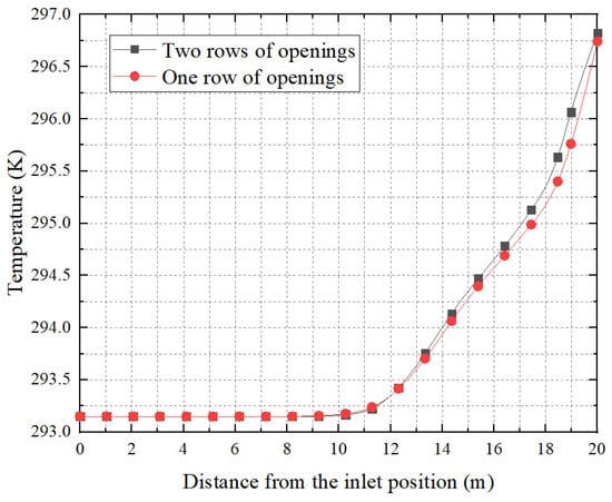 Figure 16 shows the central temperature inside the FADS tubes with one row of open holes and with two rows of open holes, both having the same number of open holes. As shown in the figure, the temperature inside both FADS tubes remains unchanged for the first 12 m. Then the temperature rise inside the duct with two rows of open holes becomes somewhat greater than in the duct with one row of open holes, and the temperature difference increases progressively, with the maximum difference exceeding 0.25 K. During the first 12 m, the flow velocity is relatively high, resulting in a small temperature rise. As a result, the temperature rise inside the two FADS tubes is nearly identical. However, beyond 12 m, the velocity decreases gradually, and the rate of temperature rise becomes greater. Additionally, the wind velocity inside the FADS ducts with one row of open holes is always higher than that of the FADS with two rows of open holes, resulting in a smaller temperature rise for the former than the latter. Therefore, it can be concluded that in situations with the same number of openings, FADS with more rows of openings result in a higher temperature rise inside the tube.