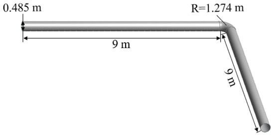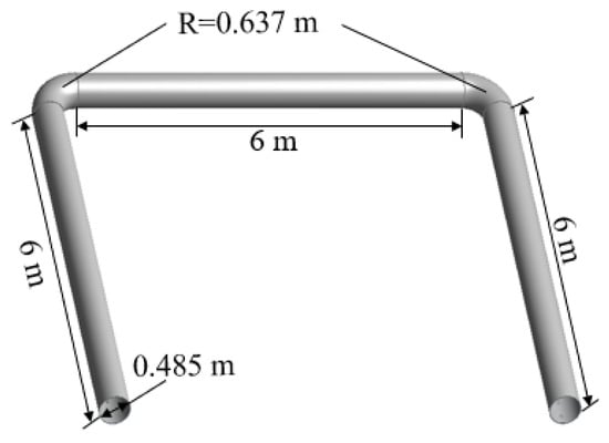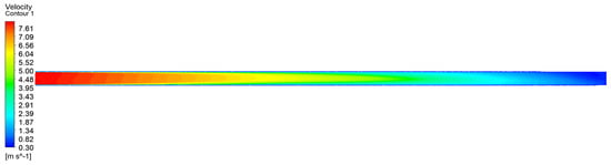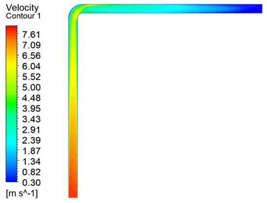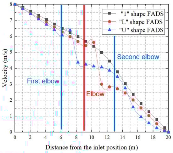 Figure 20 shows a velocity cloud diagram of the “1”-shaped FADS. It can be observed that the velocity inside the “1”-shaped FADS is relatively uniform. Except for the tail, the flow velocity inside the tube is distributed symmetrically along the centerline. The turbulence in the tail airflow caused by the end closure explains the asymmetry at the tail end. Figure 21 shows that the velocity inside the “L”-shaped FADS decreases uniformly before the elbow of the duct and changes significantly at the elbow. The velocity on the outside of the elbow decreases rapidly, while the velocity on the inside becomes larger. The velocity decreases rapidly after passing the elbow and then decreases uniformly and slowly. Figure 22 shows that the flow velocity inside the “U”-shaped FADS decreases uniformly before the first duct elbow. At the elbow, the outer speed decreases rapidly and the inner speed increases. The speed decreases after passing through the elbow, but the upper part of the middle section of the duct decreases slowly, while the lower part decreases rapidly at first and then decreases slowly. Beyond the second elbow, the speed of the outer side slowly decreases, while the inner side first rapidly decreases and then increases. The speed of the central position inside the duct after passing the second elbow is less than that on the two sides, after which the speed decreases evenly and slowly.