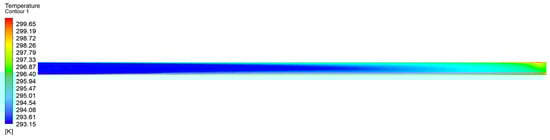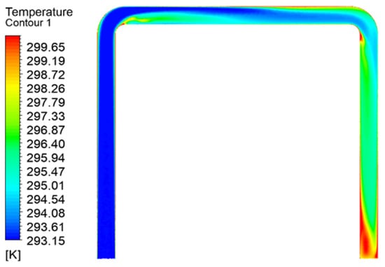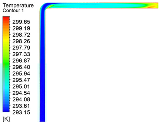 Figure 24 displays the temperature variation cloud diagram of the “1”-shaped FADS. Its internal temperature increases gradually along the axial direction, with a small temperature change at the front and a significant temperature rise on the outer sides of the middle section. The temperature distribution is roughly symmetrical with respect to the center, except for the tail, where the temperature rise is less symmetrical, with the upper part showing a larger increase than the lower part. This asymmetry is due to the turbulence caused by the backflow at the end of the closed duct. Figure 25 shows that the temperature of the “L”-shaped FADS does not change significantly before the elbow of the duct, with only a small temperature rise observed on the outside. At the elbow, there is a large temperature rise on the outside of the elbow; after passing the elbow, the temperature rise is stratified, with no change on the upper side and a rapid rise followed by a slow decline on the lower side. Subsequently, the temperature rises slowly and uniformly before increasing and decreasing again at the end due to reflux. In Figure 26, it is observed that the temperature of the “U”-shaped FADS increases slightly on the outer side before the first duct elbow, but there is no significant temperature change. After passing the first elbow, the airflow is disturbed and oscillation occurs, with the temperature on the upper side remaining unchanged while the temperature on the lower side rises rapidly and then falls slowly. At the second elbow, a stratified temperature rise is observed due to airflow turbulence, with the temperature inside the elbow first rising and then falling and the opposite change observed on the outside. The temperature distribution gradually becomes uniform, and the temperature rises slowly before increasing and decreasing again on the left and right sides due to reflux in the tail section.
