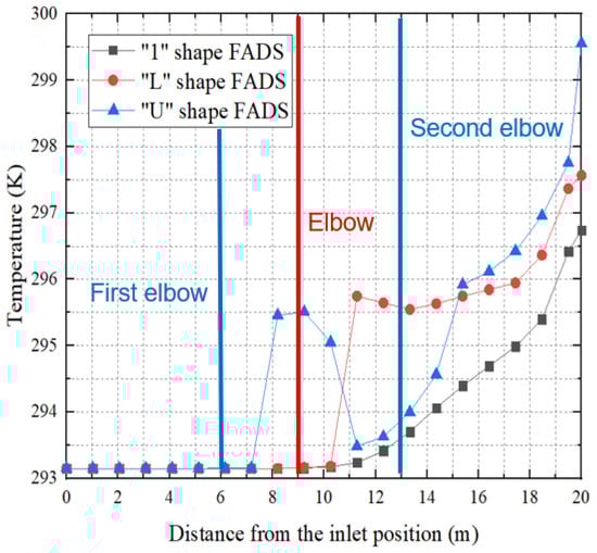 Figure 27 shows a comparison of the central temperature changes inside the FADS ducts with three different shapes: “1”, “L”, and “U”. The temperature remains unchanged for the first 7 m. The “U”-shaped FADS experiences a sudden and rapid increase in temperature of about 2.3 K at the first duct elbow due to the rapid reduction of local resistance speed. This temperature rise exceeds that of the other two FADS, but it then rapidly declines by 2 K, while the temperature in the “1”-shaped FADS only begins to rise slowly at this point. On the other hand, the “L”-shaped FADS experiences a sudden and rapid temperature rise of about 2.5 K at the elbow due to local resistance to the rapid decay of wind speed, which is higher than in the other two FADS, and the temperature rises slowly after maintaining this temperature for some distance. The temperature of the “U”-shaped FADS starts to increase rapidly after the middle and then slows down at the elbow of the second duct before increasing rapidly again, surpassing that of the “L”-shaped FADS to become the highest of the three. Finally, the temperature rise of “1”-shaped FADS is about 3.6 K, that of “L”-shaped FADS is about 4.5 K, and that of “U”-shaped FADS is about 6.5 K.